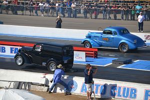 Also in D/Gas, Ron Danly in the Anglia panel van was against the 'True Blue '37 Ford of Dan Martin.