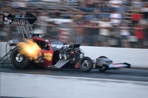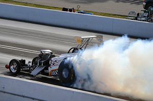 The rear engined Top Fuel Dragster of Mike Stewart and Brad Thompson appears as a sole exhibition runner at Heritage events with Mike driving. Unusually for Top Fuel, the car has a Powerglide transmission.
