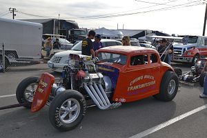 A standard bodied '56 Chevy of Pete Cogswell runs a supercharged alky engine in A/Gas.