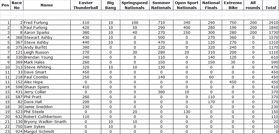 2012 U.K. NATIONAL CHAMPIONSHIP 9.50 BIKE CURRENT STANDINGS