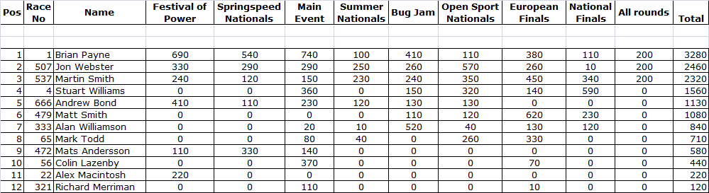 2013 U.K. NATIONAL CHAMPIONSHIP TOPSPEED AUTOMOTIVE STREET ELIMINATOR FINAL STANDINGS
