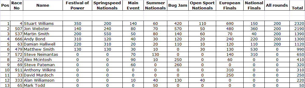 2014 U.K. NATIONAL CHAMPIONSHIP TOPSPEED AUTOMOTIVE STREET ELIMINATOR FINAL STANDINGS