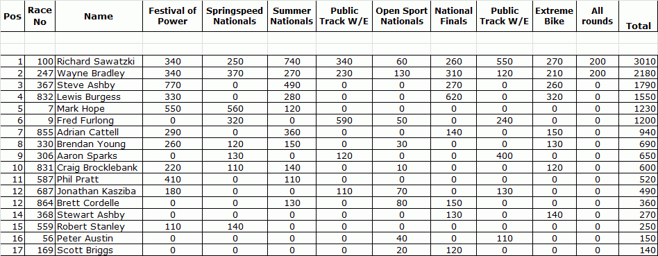 2015 U.K. NATIONAL CHAMPIONSHIP 9.50 BIKE CURRENT STANDINGS