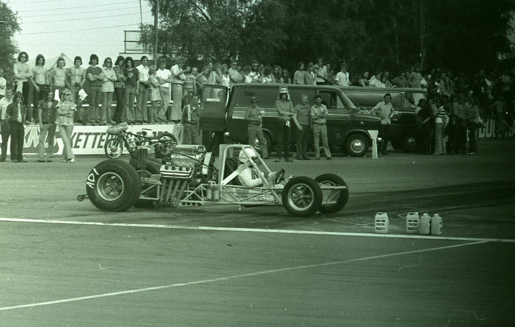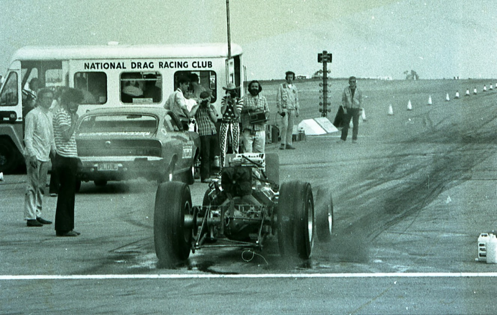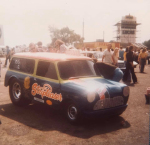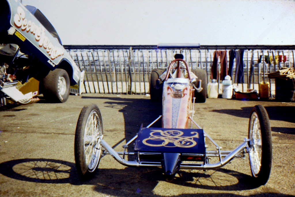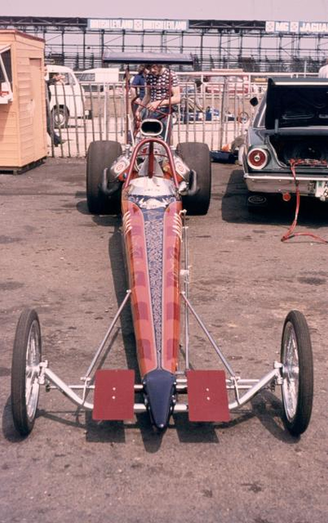 Ed Shaver was driving what would become the rear engine Vauxhall VX4/90 Funny Car, with the body still awaited at this race. The chassis was built by Mark Stratton, the early Hemi 392ci engine came from Mark’s Metronome Bond Bug Fuel Altered. John Dickson described it as ‘an overgrown go-kart’.