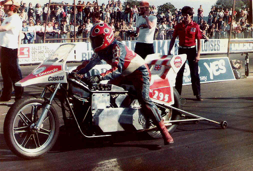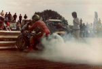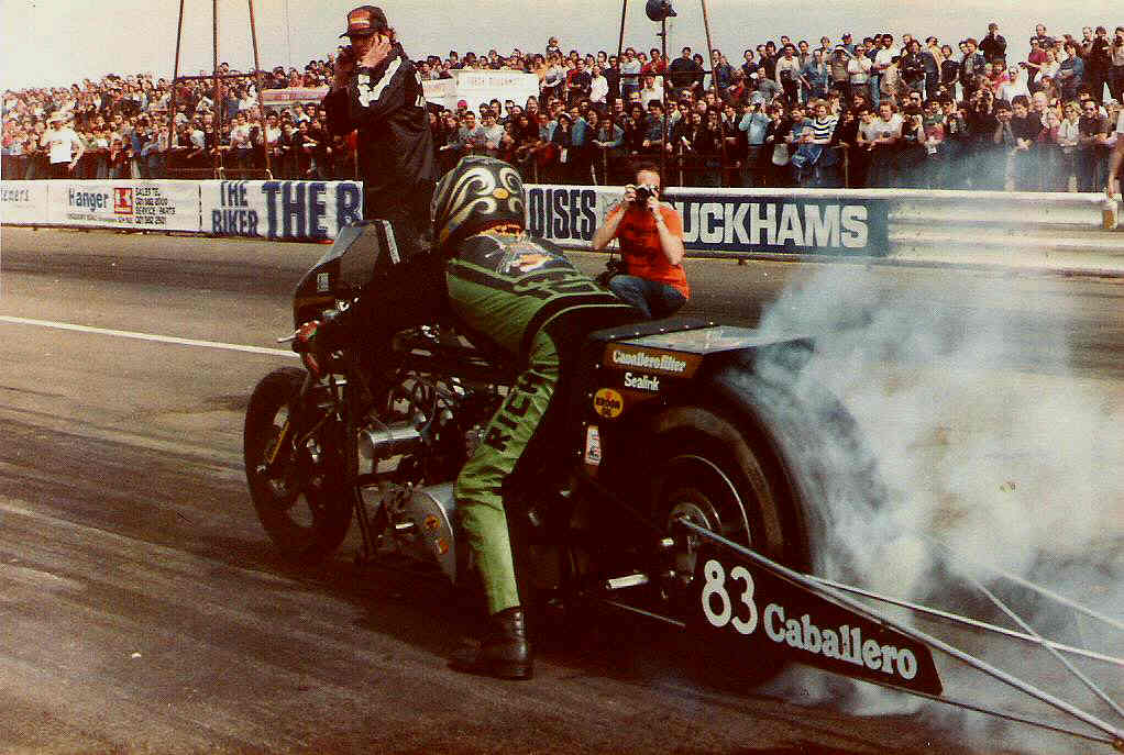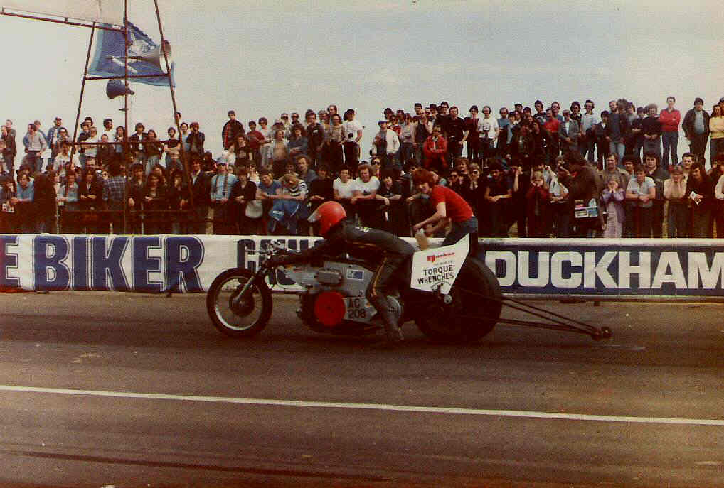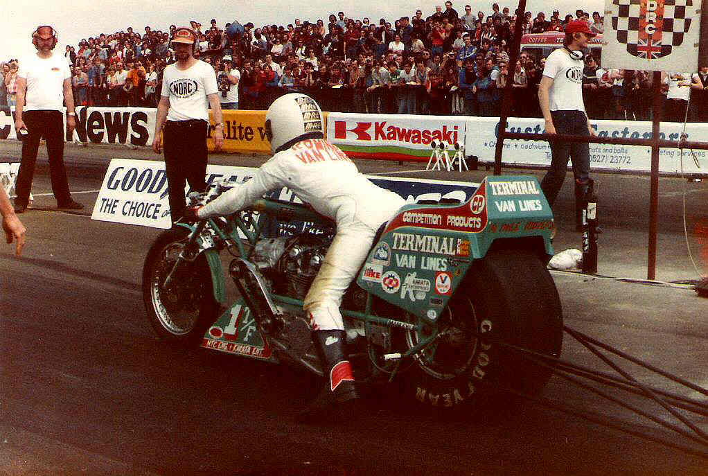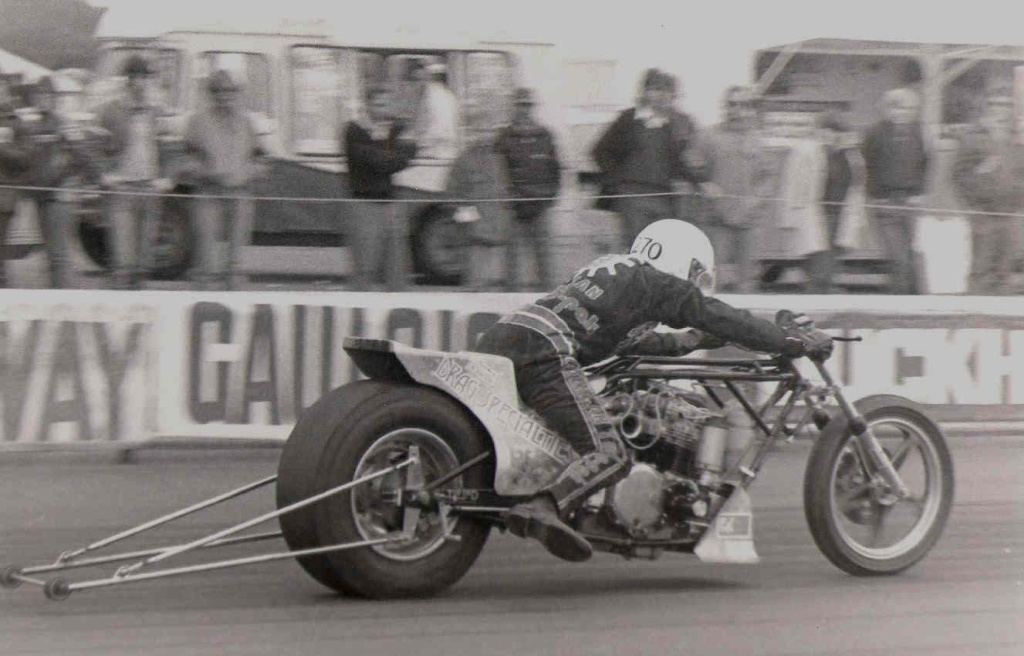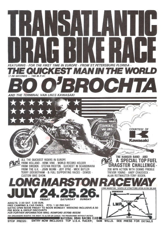 The event devised was a large bike race to be held on 24-26 July and headlining it was the quickest Top Fuel Bike in the world, ridden by Bo O’Brochta from St Petersburg, Florida. O’Brochta had run an otherworldly 7.080/196 at NHRA Ontario CA Finals 1980 to be the first rider to go quicker than Russ Collin’s 7.300 at 199.55 recorded three years earlier.