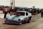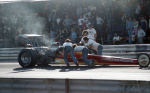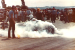 Dave Knight described the final: “As Boden went into stage, flames started to belch profusely from Young’s motor and despite attempts to douse the blaze the flames refused to be extinguished. Against the directions given by the startline crew Young insisted on continuing with the run and eventually staged alongside a very hot ‘Hitman’. On the green, Young’s car launched hard to the right narrowly missing the christmas tree. This unexpected change of direction was ably corrected but at half-track, the slicks lit up and the car veered over the centre-line. Again the commendable driving skills of Young brought the rail back under control and the rest of the quarter mile was completed without further trouble”.