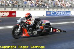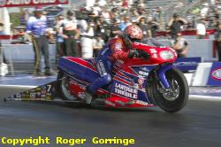 The final pitted the two teammates of new Champion Jason Line and old Champion Greg Anderson in their Summit Racing Equipment 2006 Pontiac GTOs, once more identical startline reactions had them leave together on great 0.005 lights but at the end of the race it was Greg Anderson that took the event trophy with a fine 6.652/208 as Jason Line runner upped with a 6.691/208. Pro Stock Motorcycle just fell short of the magic six-second runs that are occasionally witnessed as Andrew Hines in the heat of the day put down a 7.020/191 that stayed top of the pile all weekend. Sitting down in sixteenth place was Tom Bradford's 7.142/188 that left five unlucky non qualifiers after him.