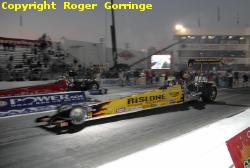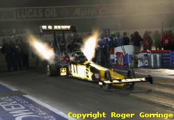 Round one opened with two contenders for the Rookie of the Year award, Hillary Will versus J.R. Todd and it was Todd out of the hole first and with a 4.534/325, beat Will by a half car length in the lights, her 4.553/325 losing. A close leave between Rod Fuller and Doug Herbert had the latter go up in smoke to record a losing 10.318/97 as Fuller powered to a 4.544/327 win. Larry Dixon got another round win with a 4.535/323 winning on a holeshot that delivered a half car lead over Cory McClenathan's close 4.543/331 charge. It was instant tyre smoke that despatched Dave Grubnic's 7.625/115 as despite a small fire in the lights Morgan Lucas took the light with a 4.685/272. Melanie Troxel got a better leave than Steve Torrence and it paid off with a 4.553/323 win to the 4.622/294 lose. Mike Strasburg was up against it alongside Brandon Bernstein and red lit away his chances slowing to a 7.645/115 as Bernstein clinched the 4.508/330 win light. Doug Kalitta worked his magic with a 4.482/331 win over the 9.095/81 given up try from Alan Bradshaw. Last pairing in the round was Tony Schumacher against David Baca and the latter lost power just after the launch leaving Schumacher to pick up the 4.489/328 win. The Championship was brewing well with the top contenders Kalitta and Schumacher still in with a chance to add to the spice of round two. Morgan Lucas gave it his all against Melanie Troxel but the lady had more power, her 4.521/329 with a holeshot beat the 4.616/305. In the last race for Miller Light, Larry Dixon went into instant tyre smoke slowing to a 10.812/94 and seeing Brandon Bernstein race away to the win with a 4.496/330. Rod Fuller started losing pistons at the thousand foot mark slowing him to a losing 4.953/210 as Tony Schumacher whacked out a fine winning 4.475/328. The luck of J.R. Todd went literally up in smoke in the last pairing at sixty feet out retarding his time to an 11.829/84 as Doug Kalitta managed to win with a 4.580/330 pass. This was the round that solid teamwork succeeded as Troxel cut a 0.026 light and coupled with the 4.502/330 beat point leader Kalitta's better 4.500/330 try giving Schumacher another chance if he got through his pairing. Bernstein cut the better light but was just plain outrun by Schumacher's 4.482/329 to the losing 4.511/332. Tony Schumacher had not only to win the event but had to card a national record pass as well if he was to beat Kalitta for the Championship so no pressure then! He would also have to deal with teammate Melanie Troxel in the Skull Shine/Torco Racing Fuels fueller. There seemed to be no team orders as Troxel shot off first on a 0.085 light and with her 4.585/308 ran hard but the U.S. ARMY machine of Tony Schumacher just swept past to record the win in a record time of 4.428 at 327mph. 'The Sarge' had done the seemingly impossible, won the event and got a national record that gave him the 2006 NHRA POWERade Top Fuel Championship. A disappointed Doug Kalitta was shown on the big screen with just an emotionless blank expression!