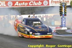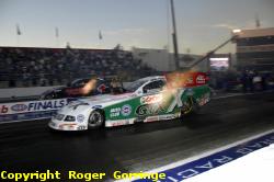It was Tommy Johnson Jr. who opened round two with a 5 dead at 279 mph victory as Gary Scelzi blazed the slicks at one hundred feet out slowing to a 7.419/116 lose. Del Worsham after a busy repair made it to about one hundred feet then went up in smoke then powering on again to a 6.366/280 allowing Gary Densham to just win the pedalfest as he also went into smoke and got crossed up at the 330 foot mark reducing his time down to a 6.345/196. In a battle of black cars Jack Beckman got the better of Scott Kalitta, Beckman carding a 4.715/332 to the up in smoke 7.548/111. John Force was on for the Championship and pressed home a 4.801/284 win as Jim Head came off the throttle at three quarter track. Bob Gilbertson limped off the line with problems recording a losing 14.577/79 as Robert Hight stormed to a great 4.706/324 win. The remaining team Force member Eric Medlen suffered tyre smoke at the two hundred and fifty foot mark decelerating to an 8.127/105 as Phil Burkart Jr. recorded a fine 4.789/326 win. The following pair of Ron Capps and Tim Wilkerson gave a great race as Wilkerson was first out of the hole rapidly followed by Capps but Capps nipped past in the lights with a 4.755/330 to the real close 4.774 identical speed. Mike Ashley not only red lit away his chances but crossed the centre line, over corrected and grazed the wall on his 4.82/283 pass leaving Tony Pedregon to pick up the win with a 4.71/259. Round two started with Gary Densham going into tyre smoke then getting sideways reducing his times to a 7.291/121 lose as Phil Burkart Jr. also slowed but took the win with a 5.186/283 ticket. The following pairing were the point leaders and it was here that John Force obtained his fourteenth Championship the NHRA POWERade Funny Car title as he beat Ron Capps with a holeshot 4.742/326 as Capps got a little crossed up down track slowing to a 5.262/204. It was good to see Force consoling Capps on the big screen after the run. Jack Beckman continued to make his mark with an all over the track 5.060/232 win to defeat the cylinder losing Tony Pedregon's 5.223/210 try. Tommy Johnson Jr. managed to make it to the four hundred foot mark before he went into tyre smoke slowing to a 6.896/135 as Robert Hight thundered to a 4.758/328 victory. The semi finals saw Burkart suffer a small fire in the lights on his 4.917/312 only to have Jack Beckman come from behind to record the win with a 4.743/323. A Team Force battle ensued as boss John Force took on his son-in-law Robert Hight, veteran reactions won as Force beat the youngster out of the traps going on to get a 4.834/265 win as Hight got out of the groove and hit a timing cone disqualifying his 4.88/261 try. With the Championship safely in his pocket John Force in the Castrol GTX Ford Mustang could have taken it easy, Force does not know the word easy and again beat the younger driver Jack Beckman off the lights. It turned out to be the quickest Funny Car race in history as Force numbered up a 4.697/319 victory as Beckman's Matco Tools Charger followed with a fabulous 4.662/329 runner up.