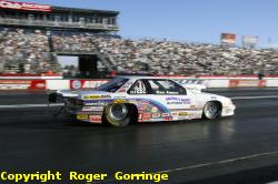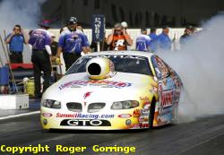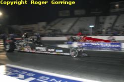 Into the second round and V. Gaines again got a good light, not as good as round one but it got him the win with a 6.701/206 as Dave Northrop followed with a 6.704/207. Mike Edwards went down to Allen Johnson's 6.675/207, the 6.703/208 not being good enough. In identical leaves from the tree it was the power from Greg Anderson's machine that got the win light with a 6.640/208 as Ron Krisher followed with a losing 6.701/206. Jason Line continued his dominance, catching and passing the leave by Dave Connolly, the 6.641/208 being the top numbers to the 6.684/207 to end the round.