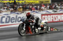 First round standout victims included Kurt Johnson to Jeg Coughlin, Warren Johnson to Jason Line, Allen Johnson to Richie Stevens Jr. and Kenny Koretsky to Tommy Lee. Into round two and Richie Stevens stunning leave got the better of Larry Morgan who failed to catch the 6.811/202 with the 6.83/202. Tom Martino suffered problems on his leave and limped to a 30.15/52 as Dave Connolly powered to a 6.776/202 win. Greg Anderson managed a 6.783/203 win over the 6.803/202 from Tommy Lee, and last pair saw Jeg Coughlins great light get overhauled by the charge of Jason Line, 6.767/203 win to the 6.81/202 lose. Dave Connolly fouled away his chances with a red light time of 6.782/203 leaving the win open for Richie Stevens Jr. whose 6.800/203 got him a place in the final. The first 2006 POWERade NHRA Champion was crowned as Jason Line took the semi final win with a holeshot 6.751/204 over teammate Greg Andersons 6.773/204 try. With the Championship firmly clinched by Jason Lines Summit Racing Equipment Pontiac GTO perhaps he had not reckoned with Richie Stevens Jr.s third stunning light of competition. A 0.002 from the Mopar/Valspar Dodge Stratus leapt out and coupled with a 6.789/202 beat the new Champs 6.735/204. Pro Stock Motorcycle