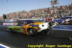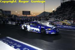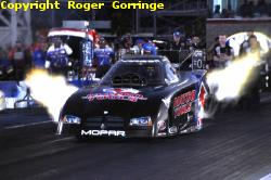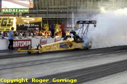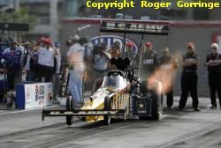 The opening round started with Aussie Dave Grubnic running a 4.609/295 over a smoking 6.731/123 from Doug Herbert. In a close race that was won on the start line Rod Fuller achieved half a car lead in the lights with a 4.569/325 as Melanie Troxel followed with a 4.567/328 lose. Steve Torrence managed to oust Cory McClenathans 4.632/320 with a holeshot 4.609/321. Continuing his charge was J.R. Todd who left well on Larry Dixon winning with a 4.539/318 to a 4.666/313. Tony Schumacher managed more points with a fine 4.488/325 win in the heat as Mike Strasburg slowed to a 5.030/209. David Baca managed to broadside his fueller just before the sand trap when his 4.585/320 remained with no chutes but it was Brandon Bernstein that clicked on the win light with a 4.549/323. Alan Bradshaw got into a bit of a weave at half track negating his 4.613/321 and allowing Hillary Will to take the win with her 4.565/324. Ending round one was the duel between Doug Kalitta and Bob Vandergriff with Kalitta leaving on Vandergriff, a 4.581/325 to a 4.689/320. Round two saw Hillary Will light the tyres at one hundred foot and again at the three thirty mark slowing her to an 8.872/83 as Doug Kalitta stormed to a 4.547 at 324mph. Rod Fuller put his holeshot to good use, carding a 4.579/327 as Brandon Bernstein chased but failed to catch with a better 4.564/326. In a battle of the Skull Shine cars J.R. Todd beat Steve Torrence by a car length in a 4.582/320 win to a 4.663/311 lose. Dave Grubnic fell foul to tyre smoke at about two hundred and fifty feet out slowing to a 7.32/110 as Tony Schumacher surged ahead with a clean 4.538/330. Todd managed another success with a 4.582/318 win over a luckless Fuller who lot power at sixty foot and recorded a lowly 20.553/31 lose. Tony Schumacher trounced points leader Doug Kalitta to end the semi finals when he ran a winning 4.494/322 to pass Kalittas startline leave but losing 4.584/327.