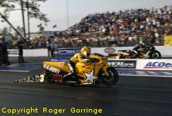 Into round one and V Gaines pulled a red light in his Kendall Oil Stratus leaving the win to Greg Stanfield with a 6.677/205 to the wasted 6.698/205. Rickie Smith leapt from the line to record a win of 6.706/205 against the close 6.702/205 from Jim Yates in the Sea Ray Boats Pontiac GTO. In an equal leave both Tom Marino and Richie Stevens Jr slugged it out up track but it was the former with a 6.696/204 that clinched the deal as the Mopar/Valspar Stratus came in with a losing 6.715/205. Max Naylor hired a Larry Morgan car to replace his wrecked machine that ended up on its roof testing a short time before the event and it paid as a 6.715/204 beat the red lit time of Mike Edwards in the Young Life/Art car. Huge cheers went up for a rising star Erica Enders when she tripped the win light with a 6.716/205 and put out the quicker 6.674/205 from Jason Line's Summit Racing Equipment GTO. Warren Johnson winner at Phoenix went out when his GM Performance Parts/Pontiac ran the losing 6.683/206 as Larry Morgan pushed to the win with a 6.676/205. Greg Anderson started to dominate again a 6.664/206 defeated the 6.715/204 from Dave Howard. Finally in round one Ron Krisher got the ticket with his 6.725/205 as Allen Johnson in the J&J Racing /Mopar Stratus ran a red light lose of 13.135/63. Round two erupted in more cheers as once again Erica Enders put away a big name, this time Rickie Smith in the Skull Gear '06 Cobalt, a 6.712/205 lost as the 0.032 r.t against the close 0.038 worked well for the young lady coupled with a 6.713/204. Tom Martino advanced another round with a 6.706/205 putting out Max Naylor's Jagermeister backed machine that lost with a 6.724/203. It was Larry Morgan's turn in the ZMax Dodge Stratus to take a loss with a 6.783/203 as Ron Krisher caught and passed the holeshot and ran a winning 6.684/205. The rounds biggest upset came when Greg Anderson was caught unawares as Greg Stanfield strapped a fine 0.012 leave on him and won with a 6.669/205 as Anderson followed in the wake with a 6.670/205. Erica Enders delivered again to start the semi finals when she pushed Ron Krisher's Valvoline Cobalt into a red light wasted 6.711/204 to her winning 6.735/205. Tom Martino then put away the previous rounds giant killer Greg Stanfield in the Piranaz Racing GTO, a 6.700/204.35 with a 0.014 leave got the better of the 6.700/205.29 with a 0.017 light. The hopes and dreams of Erica Enders and the Slammers Ultimate Milk '06 Cobalt were dashed in the final as she overpowered the track and got crossed up just off the startline slowing to a lowly 18.482/41 as Tom Martino in the Kendall Oil Dodge Stratus zoomed to the 6.677/205 win. Pro Stock Motorcycle