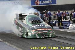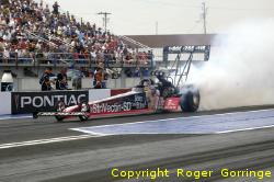 The round one battles began with the defeat of Jeff Arend in his Erie Processing/VF Trucking/Craftsman '05 Monte Carlo his 4.938/291 was left behind Eric Medlen's 4.824/315 pass. Tony Bartone managed to overcome a great holeshot by Jim Head running the winning 4.813/324 as Head came in second with a 4.992/314. Tony Pedregon then took on his old boss John Force and it was the experience that told as Force pounded out a 4.775/319 to the losing 5.018/279 from the Q Power machine, brother Cruz Pedregon fared better as his 5.526/273 was pedalled more consistently than that of the equally up in smoke Whit Bazemore in the Matco Tools '06 Dodge Charger whose 5.706/262 lost. Tommy Johnson Jr. in the Skoal Racing Monte Carlo got a little loose at the top end eliminating his holeshot 4.829/325 as Robert Hight passed him to record a winning 4.764/323. A real close encounter followed with Gary Densham in the Racebricks machine scored a losing 4.828/320 as Phil Burkart Jr. with the slightly better light stayed ahead with the winning 4.874/322. You couldn't get much closer than the next pairing as both ran a 4.799 but it was Ron Capps lead that held as Mike Ashley in the Skull Racing Gear Monte Carlo lost with a 4.799/322. The 2005 Champion Gary Scelzi in the only other Dodge Charger backed by Mopar/Oakley was left at the lights by Del Worsham who ran the 4.858/323 win to the 4.842/322 lose to end round one. Eric Medlen took the win against Cruz Pedregon to open round two a 4.829/321 beat the weaving 4.835/312 from the Advance Auto Parts Monte Carlo. Tony Bartone fouled away his chances as his Lucas Oil Products machine red lit to a slowed up 5.301/196 allowing Ron Capps to push his Stratus to the win with a 4.810/317. John Force managed to catch and pass the better leave from Del Worsham's Checker Schuck's Kragen backed Monte Carlo a 4.798/322 beat the 4.818/318 try. Ending round two was the winning 4.799/321 from Robert Hight who despatched the 4.915/319 from Phil Burkart Jr. in the other Checker Schuck's Kragen car. Ron Capps capitalized on the bad luck of Eric Medlen in the Castrol Syntec/Ford as the car suffered a brief bang and small fire at around the 400 foot mark, Capps went on to record a fine 4.871/319. Team-mates, boss and son-in-law John Force and Robert Hight faced off and there was no give on either side, Hight left first and ran a 4.770/316 in the Auto Club of Southern California/Ford Mustang but experience came through as John Force nipped in to take the win with a 4.752/323. The Funny Car final was left to Ron Capps in the Brut Dodge Stratus and John Force in the Castrol GTX/Ford Mustang and it was all over just off the start line as Force despite changing lanes shook and hopped up off the race track then went into tyre smoke getting crossed up and hitting one of the centre timing blocks negating any chances of a win, his 4.990/305 was incidental as Ron Capps pushed his Brut sponsored car to his first win against Force in eight years running a 4.860/316. Pro Stock