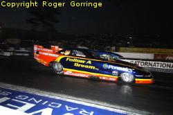 Round two opened with Larry Dixon's Miller Light/Mac Tools/ Lucas Oil machine failing to catch the better leave of opponent Doug Kalitta, the slower figures along with a good weave at the top end of 4.594/302 won against the chasing 4.562/314. It was the turn of Cory McClenathan in the Carrier Boyz/Fram Boost 2 car to go up in smoke this time at the 200 foot mark slowing his charge to a lowly 11.410/79 as Doug Herbert pushed his entry to the 4.577/320 victory. The opposite lane then produced the next smoker as Bob Vandergriff lit them up instantly in the UPS sponsored car slowing to a 7.722/119 as Dave Grubnic pounded out a good 4.542/322 win. Once again the smoke devils hit in that lane as this time Morgan Lucas in the Lucas Oil dragster hit smoke at sixty feet out pulling his car down to a 7.223/112 lose as Melanie Troxel powered to the win with a 4.726 at just 243 as she got mightily close to the centre line at half track. Melanie Troxel continued her onslaught with a 4.521/327 win over a pedalling Doug Herbert, the Snap-On Tools car hit tyre smoke at half track and tried to rescue it but the 6.057/154 told the tale. It was all over for the Mac Tools entry of Doug Kalitta despite a small holeshot, the 4.727/308 lost to the 4.566/320 from Dave Grubnic to end the semi finals. The final gave the packed house the end result when Melanie Troxel in the Skull Gear/Torco Race Fuels machine faced the Strivectin-SD entry driven by Dave Grubnic. Troxel led out of the hole then overpowered the track as she hit tyre smoke just one hundred feet out slowing her to a 7.99/93 lose and allowing Grubnic to zip past to record the winning numbers of 4.943/317 to end a perfect finals day by late afternoon. Funny Car