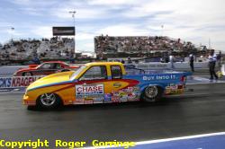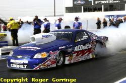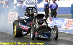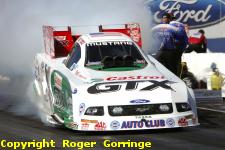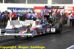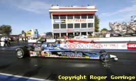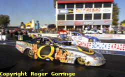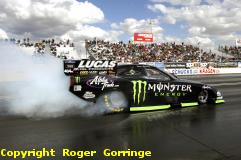 The first round kicked off with Ashley Force getting crossed up at three quarter track and crossing the centre line kicking out the reflector blocks and clicking on Bob Gilbertson's lights giving him the win. Mike Ashley could not select reverse after the burnout and motored through allowing Tim Wilkerson an easy solo win 5.013/260. Scott Kalitta went up in smoke at four hundred feet out and lost with a 7.767/106 as Tony Pedregon ran a 4.701/326 winner. Jeff Arend managed a troubled 5.506/214 as Robert Hight got crossed up but lit the win light with a 5.104 221. Another smoking battle took place when Gary Densham beat an equally plagued Gary Scelzi the winning numbers of 5.737/231 went to Densham a Scelzi followed with a 5.760/215. John Force was left popping and banging from the three quarter mark and his 4.862/303 was beaten by Ron Capps' 4.837/305. A big defeat went to Jim Head as he out powered Tommy Johnson Jr who suffered tyre shake and tried to pedal his way out of it, Head ran the winning 4.777/326 to the 7.514/118. The last pair in the round saw another pedalfest between Jack Beckman and Eric Medlen and it was the latter that was victorious with a winning 5.814/207 beating the 6.866/136. Round two had Gary Densham on a roll as he zoomed to a 4.890/288 victory as Bob Gilbertson shook and was off the throttle by half track, his 9.622/87 going nowhere. Team mates Robert Hight and Eric Medlen were the next pair to face off with Hight still hoping to back up his qualifier class best but he was throwing out cylinders at three quarter track slowing him to a 4.908/310 win as Medlen suddenly hooked right just off the startline and realising he was done idled to a 12.008/77 lose. Ron Capps took just 4.766 seconds at 318 to complete his lap as Tim Wilkerson shook and pedalled to a 5.247/222 lose. Tony Pedregon managed a 4.924/254 complete with a small fire that singed his lower firesuit but despite the problems he won as Jim Head followed through with a troubled 5.729//168 to end the round. It was a narrow squeak for Pedregon in his bout with Densham as Densham went up in smoke at one hundred feet out, Pedregon came close to losing as he came dangerously close to the centreline but managed to stay his side of the track to gain a 5.077/233 win as Densham slowed to a 9.650/96 lose. Hight managed to get some revenge for team Force as he despatched the boss' nemesis Ron Capps with a 4.783/233 as Capps pulled a red light 5.292/192. It was all left to Robert Hight in the Automobile Club of California/Ford to secure a record ET and take the win in the final but it all went away as he shook, went into tyre smoke and got crossed up as Tony Pedregon in the Q Racing Chevy Monte Carlo hammered out a 4.803/326 winner, his first since St Louis last year.
