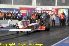 Round one held some surprises as some big upsets occurred beginning with the immediate up in smoke effort by Larry Dixon, his 9.998/92 eclipsed by Cory McClenathan's 4.528/322 win. Winternationals winner JR Todd also succumbed to the tyre smoke demons as he blazed the slicks and pedalled twice to a 9.715/96 as Bob Vandergriff ran a 4.853/323 winner. Whit Bazemore continued to do well wringing out a 4.513/326 to down Hillary Will's solid effort 4.589/321 beating her by a car length. Likeable Clay Millican was losing parts at the top end but clicked on the win light with a 4.802/247 as opponent Doug Foley had a multi pedalling job to get to the stripe with a losing 5.353/178. Dave Grubnic went into almost immediate tyre smoke slowing to a 9.553/79 as Rod Fuller maintained his efforts with a winning 4.466/329. Tony Schumacher and Doug Herbert left almost together but it was Schumacher's call as he posted a 4.498/328 win to Herbert's on-off the throttle 6.879/118 lose. Surprisingly Doug Kalitta who only made it into the lower half of the field went out in round one with a pedalled 4.595/326 to Brandon Bernstein's winning 4.457/329 and to end the round Melanie Troxel caught and passed a tyre smoking Morgan Lucas, a 4.492/330 taking out the troubled 7.576/105. Clay Millican almost managed to hold on to his recent luck but it deserted him at the top end when he seemed to lose power and Whit Bazemore streaked past, the 4.582/321 beating the holeshot 4.650/253. The parachute deployed at half track on Cory McClenatan's ride slowing him to a 5.223/164 as Tony Schumacher scorched past on a 4.461/324 winner. Bob Vandergriff left a trail of oil after some cylinders went away giving him a troubled 5.253/194 lose as Rod Fuller ran a consistent 4.476/328 winner. The final pair in the round gave everyone a real pedal-fest as both Melanie Troxel and Brandon Bernstein fought to regain control in their crossed up multi pedalling efforts it was Troxel who got there first with a 6.712/172 and Bernstein lost with a 6.815/115 try. "It wasn't pretty but we'll take it" Troxel said afterwards. Bazemore and Fuller both out of the David Powers Homes stable slugged it out in the semis but the new boy to the class dropped cylinders and hazed the slicks at half track slowing him to a 4.808/246 and allowed Fuller to keep ahead on his holeshot to record the 4.525/326 win. Former team mates Troxel and Schumacher faced off and in a stunner of a lap Troxel held her own as Schumacher lost some cylinders at half track, a 4.539/328 beat the 4.660/292. The conclusion would be a repeat of last years Phoenix final, Melanie Troxel now in the Evan Knoll's Torco Race Fuels/Lucas Oils Welcome Home War Veterans machine launched after Rod Fuller in the Valvoline/Matco Tools rail but her 4.536/325 was not enough as Fuller kept the pace winning with a 4.490/327.