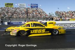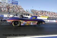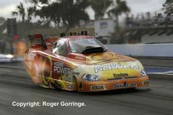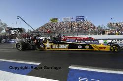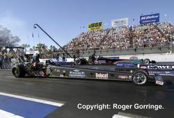 Larry Dixon opened the Sunday eliminations with a 4.592/314 win over Doug Herbert's very close 4.598/322 lose. Another reasonably close contest saw Brandon Bernstein wrap up his second round place as his 4.593/328 beat the 4.623/322 from Clay Millican. Hillary Will once again began turning up the speed numbers with best of 330.63 mph coupled with a 4.582 to oust Cory McClenathan's 4.619/318. FIA European Champion, Switzerland's Urs Erbacher came off the throttle with problems slowing to an 8.386/102 leaving Rod Fuller to get the win with a 4.590/325. Alan Bradshaw's earlier qualifying luck deserted him as he went into instant smoke and despite trying to pedal slowed to a 8.386/103 only to watch Bruce Litton charge to a 4.655/323 win. Antron Brown notched up another round win when he despatched Doug Foley with a holeshot 4.604/327 to the blower belt losing 4.928/217. It was Dave Grubnic this time that fell victim to the instant smoke, recording a given-up 11.723/78 as Michael Gunderson reaped the reward with a 4.722/305 win. The last pairing of round one was Tony Schumacher against J.R. Todd with Todd leaving first then burying the slicks in smoke as Schumacher drove by to record the win with a 4.612/314 to the slowed up 9.647/87 try. Round two opened with Tony Schumacher getting the better of Antron Brown as the latter hit tyre smoke at sixty feet out and slowed to a 9.495/68 lose as Schumacher charged to a 4.596/320 win. Michael Gunderson's day ended with a loss in the pedal fest with Brandon Bernstein, Gunderson hit smoke first then Bernstein both pedalling for all they were worth but Bernstein regained enough to click the win light on with a 6.782/218 to the losing 8.135/135. Hillary Will continued well getting past a tyre hazing at half track Rod Fuller and wrapping up the 4.694/316 win to the 5.305/200 try from Fuller. Bruce Litton's day ended with a slowed up 10.587/86 as Larry Dixon took the win with a 5.112/268. Down to the last four in the semi finals and each pair gave it their all in an attempt to reach a finals placing. Brandon Bernstein left first in his bout with Hillary Will in the KB Racing/LLC machine and put her out as his 4.666/322 carded the win to her losing 4.672/325. Larry Dixon in his attempt in the U.S. Smokeless Tobacco car oiled the top end of the track when his 4.850/274 was just not enough to beat the 4.741/304 from Tony Schumacher's car. Finals time and the last pair to go down the track in front of the capacity crowd and the live TV audience and it was no holds barred as the U.S. Army dragster of Tony Schumacher left a tad before the Budweiser King/Lucas Oil car of Brandon Bernstein and held on to take the all important title with a 4.603/325 to the 4.665/323.