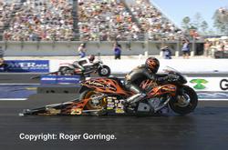 Round one started with Karen Stoffer lifting just after her leave slowing to a 9.304/89 and allowing Chris Rivas to win with a 7.057/186. Angelle Sampey proved her worth on her new ride; a 7.152/185 gave her the win against the red lighting 7.137/184 from Paul Gast. Angie McBride overcame the better leave but slowing 10.433/80 from Wesley Wells with her heavily leaning 7.613/151 win. A great leave by Hector Arana was no match for the flying Matt Guidera's 6.955/189 win to the 7.115/187 try. An almost perfect light gave Eddie Krawiec a 6.972/190 win as Michael Ray failed to keep up losing on a 7.250/180. Shawn Gann unfortunately broke leaving Chip Ellis to solo for the ticket, a 6.975/189 did the trick. A pretty good light from Junior Pippin was just no match for Andrew Hines; a 7.187/180 was beaten by the 6.969/185. Edward Murphy redlit away any chance he had and Matt Smith saw it and coasted to the 22.005/29 win, the 7.232/181 wasted. Angelle Sampey carded her best competition number with a 7.054/186 but to no avail as Matt Smith captured the win with a stout 6.963/189 putting her out in round two. Eddie Krawiec wasted his 7.030/177 with a red light giving the win to Chip Ellis whose 7.017/185 got the better of the day. The better leave by Chris Rivas did him no favours as Matt Guidera rode round him scoring the win with a 6.944/192 against the losing 7.065/189. Angie McBride came off the throttle about one hundred and fifty feet out slowing to the losing 12.043/63 as Andrew Hines powered to a winning 6.956/190. A perfect light for Andrew Hines opened the semi finals and zipped together with a 6.973/190 it beat the almost exact timings from Matt Smith's Nitro Fish/Red Line Oil/MSR '08 Buell, 6.973/190 lose. Chip Ellis on the Schumacher Electric Suzuki TL 1000 broke before the line and left Matt Guidera to solo for the win ticket, a 6.943/191 made the final. It was two booming American bikes that made the final, the Mohegan Sun/Rocklin Racing '08 Buell of Matt Guidera and the Screamin' Eagle/Vance & Hines '07 Harley-Davidson V-Rod of Andrew Hines. It was Guidera that got the best leave and he hung on to that scoring the event title with a 6.949/191 as Hines chased ineffectually with the runner up time of 6.985/189.