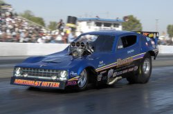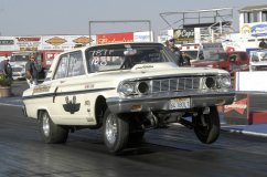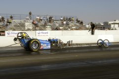 There were just seven cars in Junior Fuel A led by Scott Parks with a 6.872/193 with JD Zink a tad behind with a 6.924/190. Once again the top pair in qualifying met in the final and Zink got away on a holeshot but the 6.964/191 was chased down by the winning 6.838/194 from Scott Parks. Bob Lander drove the best numbers in Junior Fuel B qualifying. A 7.121/185 led the small field of seven racers. Lander was taken out in round two by eventual winner Don Enriquez who in the final beat Fred Notzka. Despite a perfect light coupled with a 7.184/179 Notzka was chased down as Don Enriquez won with a 7.138/186.