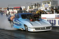 Into round two where Mike Harstead's '69 Charger ran a 7.41/132 as Terry Capp blistered down the track with a winning 5.87/248. Kris Krabitt managed a 5.84/242 win as Stephan Romanazzi took his '77 Firebird close to the wall losing with a 5.94/239. Bucky Austin was in a rapacious mood his 5.79/243 beat Jack Wright's '70 Challenger. Leah LeDuc formally Leah Pruett was in the hot seat of the Dickies backed Plueger & Gyger '71 Mustang and her 5.90/238 beat the time from Mark Saunders 'Mr. Explosion' '70 Chevy to end the round. The final came down to a run off between the original pacesetters Kris Krabill in the 'Pedaler' 1979 Plymouth Arrow and the Bucky's Mufflers Brakes Radiators 1978 Plymouth Arrow of Bucky Austin. It was all Austin as the car ran a 5.74/244 to take the win as Krabill followed with a 5.81/255 runner up. It was a Canadian-owned car, the 1963 Corvette of Jirka Kaplan, that ruled the roost in the exciting AA/Gas class where seventeen runners vied for position with a 6.420/213 from Kaplan gaining the pole position ahead of second place Mike Leonard on a 6.666/207. It was this pair that met for the money run and despite Leonard's plain matt black Chevelle leaving first, Kaplan drove past him taking the event win back to Canada with a 6.624/207 to the losing 6.727/203.