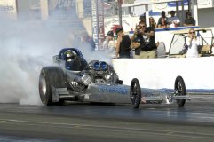 The eliminations started early afternoon on Saturday with cool air providing a healthy mix for the motors and Rick White began his rout of the class, a 5.776/255 beat the weaving Terry Cox's 7.934/115. Troy Green kept up his side of the show with a 5.783/252 defeat of Rick Rogers whose 5.823/240 trailed lots of smoke in the lights. Brendan Murry was off the throttle by four hundred feet slowing to a 10.316/76 lose as Brett Harris claimed the win with a fine 5.746/261.02, the mph being top speed of the meet. Jack Harris plumed smoke at the top end necessitating a clean up on his 5.912/219 only to have Jim Murphy win with a 5.781/257. A trail of oil after the burnout had Rick Williamson shut off allowing Mike McLennan a pedalling 7.573/108 win. Pete Kaiser beat an on off and shut down by half track Ed Schartz with a 5.974/250 to the slowed up 10.088/76. Shannon Stuart got somewhat wayward and crossed the centreline disqualifying his 7.141/133 as Adam Sorokin managed a 6.158/177 win. The last pair had Denver Schutz hit the reflector blocks negating his 6.764/139 and handing the win to Mark Malde whose easy 14.520/57 got the nod. Round two was started late Sunday morning with Rick White continuing his dominance with a 5.782/246 thrashing of a piston smoking Mark Malde's 6.609/152 necessitating a clean up from half track. Pete Kaiser went up in smoke, pedalling the car before going into tyre smoke again slowing him to a 9.750/80 and another clean up as Brett Harris clinched another bracket like win with a 5.795/249. A great drag race between Jim Murphy and Mike McLennan ended with Murphy clinching the deal with a 5.820/237 as the holeshot 5.988/244 from McLennan lost and left the track crew with yet another clean up. Adam Sorokin managed to smoke some pistons at the thousand foot mark slowing him to a 6.196/193 as Troy Green powered through with a 5.701/254 win. The semi finals produced two awards, firstly Brett Harris ran the low ET of the event with a 5.696/260 that beat the 5.810/258 from the clean looking machine of Jim Murphy then the Top Fuel National Champion was crowned as Troy Green, despite losing with a piston smoking 6.036/203 claimed the thrown as Rick White stayed ahead with the 5.770/253 win. The final was at five p.m. on the dot, the last race of the day but a disappointed Brett 'The Sheriff' Harris could only watch as his machine was shut off with problems before the startline allowing Rick White in the Autopower/CNC/Neal & White dragster to solo to the event win with a 5.819/255 the only time in eliminations he did not run a 5.7.