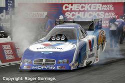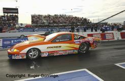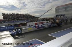 Round one began with Larry Dixon getting the win with a 4.610 and a slowing 277 mph as Morgan Lucas went into early tyre smoke and coasted to an 8.324/87. The right lane was proving to be the one to be in as Bob Vandergriff Jr notched up a 4.593/328 victory as Winternationals runner-up Cory McClenathan blazed the slicks at the sixty foot mark slowing to an 11.011/79 try. No tyre smoke in the next pairing though when Doug Herbert put down a fine 4.598/323 only to have it pipped at the post by Antron Brown's 4.536/329 from behind! Again the right lane delivered as Tony Schumacher despatched Doug Kalitta with a 4.541/329 to the losing 4.817/308. Steve Chrisman continued the smokers with an instant in-smoke 11.340/109 lose as Brandon Bernstein ran the winner with a 4.623/323. The smoke came from the good lane next as Hillary Will hit smoke at sixty feet out shutting down to a losing 10.431/76 as a surprise win went to Mike Strasburg who delivered a pedalled winning 5.568/174. A pretty close leave by both Dave Grubnic and Troy Buff came out in favour of Grubnic whose 4.5 dead at 330 mph beat the 4.644/304. The last pairing produced another good bout as Rod Fuller ran the winning 4.562/319 winning on the holeshot against the 4.642/294 from J.R. Todd. Brandon Bernstein hit instant smoke as round two opened and his battle with Larry Dixon was over with a 12.113/78 try as he watched Dixon's winning 4.609/319 come up on the scoreboards. A pedal-fest was next as Tony Schumacher faced Antron Brown with the latter first in smoke then Schumacher at half track with some damage that oiled the race surface, Brown's 5.916/203 was beaten with a 5.257/181. Rod Fuller made short work of Mike Strasburg with a fine 4.491/328 to the slowing 4.982/217. Ending the round was another good number as Dave Grubnic matched Fuller's efforts with a winning 4.491 at 323 mph beating the 4.621/324 from Bob Vandergriff Jr. The semi finals first pairing had Larry Dixon get the better leave then the win light with a 4.534/326 as Tony Schumacher failed to catch up as the U.S. Army car lost with a 4.529/325. Rod Fuller who won last years event went into heavy smoke just off the startline in the Caterpillar machine negating his chances as Dave Grubnic zoomed to a 4.519/332 win. Dave Grubnic in the sadly all black Kalitta Air dragster who has at present no major sponsor colours or lettering could have been favourite after his earlier 4.4 but he over powered the track, going into smoke at half track and despite gallantly pedalling, his 5.002/259 was no match for the 4.532/327 that came from the U.S. Smokeless Tobacco car driven by Larry Dixon now the sole car owned by Don Prudhomme.