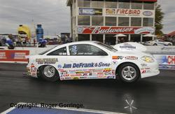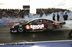 Round one kicked off with a red light for Ron Krisher, his 6.651/206 wasted as Mike Edwards ran the winning 6.660/205. V Gaines put down a 6.663/204 to down the 6.757/184 from Greg Stanfield. A terrific 0.000 light from current Champion, Jeg Coughlin was probably attributable to the urgent red light leave from Justin Humphreys who slowed to a defeated 12.789/67 as Coughlin won on a 6.637/207 pass. Jason Line managed a 6.654/208 win as Max Naylor could not quite get the numbers with his 6.690/205. Warren Johnson caught and passed the better leave by Tom Hammond, reeling him in with a 6.646/206 win to the 6.723/204 lose. The eliminations took a short break here as the overcast conditions spilt a few drops of rain onto the track but thankfully not as much as the NASCAR event back in California was suffering. A near identical leave by Greg Anderson and Kenny Koretsky went in favour of Anderson with a 6.704/208 win to the 6.790/204. Allen Johnson had a catch up job to do when Johnny Gray left first but Johnson carded the 6.629/208 win as Gray came in second with a 6.709/204. The last pairing of the round had Kurt Johnson notch up a 6.640/208 win as Matt Hartford could not quite match the numbers, his 6.686/204 just failing. A huge surprise ensued in the opening pair of the second round as Greg Anderson failed to catch the superb leave by V Gaines, a 6.683/205 beat the 6.703/207 try. Jason Line also managed a stout leave and used it to his advantage in the duel against Kurt Johnson, the 6.662/207 told the tale against the early shut off 14.763/56 from KJ. Jeg Coughlin was away first against Warren Johnson and recorded a 6.653/207 that beat WJ's 6.660/206. Mike Edwards gained a perfect light and coupled with his 6.671/205 gave him the win over the early shut off 20.094/39 from Allen Johnson. An identical leave by both Jason Line and Mike Edwards went in favour of Line as his 6.657/208 beat the 6.678/206 of Edward's Young Life/Penhall backed Pontiac GTO to open the semis. V Gaines cut another good light and together with his 6.676/205 beat the 2007 Champion, Jeg Coughlin's Jegs.Com '08 Cobalt who lost with a better 6.654/207. Finals time and the 2006 Champion Jason Line in the Summit Racing Equipment '08 GXP faced V Gaines in the Kendall Oil backed '07 Dodge Stratus and once again Gaines pulled a good light and hung on for the win with a 6.702/205 win to the off the throttle at the sixty foot try from Line.