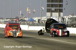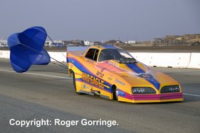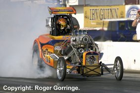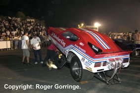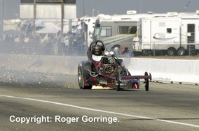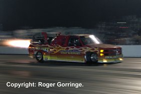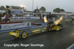 Coming up the other side of the ladder was last years Champion Troy Green in his High Speed Motorsports Donovan-powered rail, a 6.055/230 put paid to the eased up 7.041/218 from Denver Schutz's Raisin Express. Next, Rick Rogers pulled a cherry handing the win to Green with a 5.983/222 to the wasted 5.978/242. A huge clean-up operation had to be completed after Brett Harris' motor went bang just after the tree slowing to a 10.051/98 as Green sped to a fine 5.879/226 win. The final occurred as both Troy Green and Rick McGee faced off in the dark with McGee leaving first quickly followed by Green but in the traps it was Rick McGee that lit the win lights, a neat 5.761/247 took the trophy over the 5.919/252.