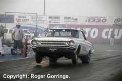 A massive field of twenty-six cars fought for a place in the sixteen car A/Gas eliminator and they were led by Jim Godec in his '37 Chevy on a 7.610/175. Godec lasted until the semi, going out to event winner Chris Beanes in a '51 Henry J. It was Beanes that took the win with a 7.676/167 as opponent Rob Patten's 7.749/180 came second.