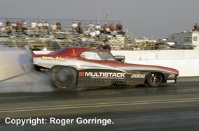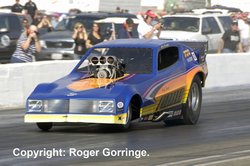 Kris Krabill will always have something to boast about as he took out the 2008 NHRA Funny Car National Champion Cruz Pedregon who was driving a Joe Pisano '78 Plymouth Arrow, the 5.907/243 plain beat the 6.015/224. Canadian Tim Boychuk driving a neat Castrol '77 Firebird was only able to follow as Krabill left for another 5.921/243 victory to the crossed up and close to the wall 8.819/99 lose. Josh Crawford shoeing a, plain silver '69 Mustang made his way through the field with a first round conquest of number one qualifier Garrett Bateman who got well crossed up and went over the centre line allowing Crawford the win with a 6.039/238. A heck of a close race ensued when Crawford ran against Mike Savage in his '70 Barracuda, eight thousandths separated them at the start and Crawford notched up the win light with a fine 5.888/240 to the 5.938/241 try. It was all frustration for Josh Crawford in the final as he rumped the car up to the line but his last rump pushing him through the beams immediately gaining a red light and handing a very nice win to Kris Krabill's eased up 7.192/135.