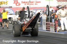 Bob Lander led the eleven-car Junior Fuel pack with a 7.078/187 then went on to take the trophy with wins over JD Zink, 7.105/187 to a losing 7.697/153, then a 7.150/186 beat the 7.222/185 from Don Enriquez. Bud Hammer left first in the final but slewed around his lane from half track slowing to a 9.416/94 as Bob Lander wrapped up the win with a 7.888/180.