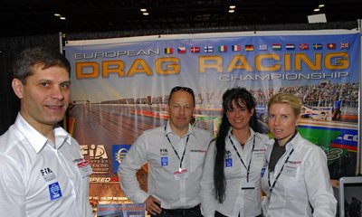 2009 Performance Racing Industry Show Report and pictures by US Correspondent Ed O'Connell Click on any picture for large version, and scroll down for additional photographs The PRI Show is held in the huge-beyond-imagination Orlando Convention Center. The first thing one sees upon entering any one of the hundreds of entrances is a large sign saying No cameras or video equipment allowed in the hall. As someone who has always felt that everything that moves and most stationary objects must be photographed to the best of our ability, this was a very disturbing message. Not because of what it prohibited, but because I had only brought my very obvious and large Nikon with protruding Speedlight and had left the stealth equipment at home. I knew I would have no trouble getting a few required photos before being tossed out into the Florida heat; after all, Eurodragster.com got me started on my life of crime with my run-in with the Swedish Police in 2008. Armed with a floor plan and observing the well marked aisle system, I easily found the well-designed Speedgroup booth and sat down with CEO Michael Gullqvist. "Speedgroup is here at the PRI Show for the first time to promote European drag racing, and make the US market more aware of the quality of European events, and hopefully to increase participation in the contingency programme among the many manufactures and suppliers attending the show", said Michael. "The first year running the FIA and UEM Championship series was very rewarding for us, with record crowds at each event, great weather, and excellent record breaking performances on the track. I was pleased to see how strong the Top Methanol Dragster class was this year and the interest that the two combinations generate, also the strength of the Pro Mod class, with thirty three different drivers competing and the most diversity in terms of the number of countries represented. The effort required to run the Championship was pretty much as I expected although the time consumed by 'soft' off track duties - arranging TV production, web site maintenance, arranging the awards gala etc - was a bit surprising.