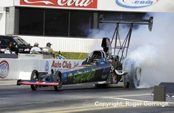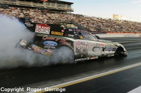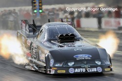 Losers in round one of eliminations had many big names among them, defending Champion Robert Hight went into tyre smoke at two hundred feet then got loose allowing Melanie Troxel a 4.260/287 win despite banging the blower. Ron Capps was run down by Del Worsham who took the light by half a car length. A battle of brothers had Tony Pedregon just nip in with a 4.230/289 as Cruz Pedregon lost by mere inches with a close 4.221/292. Jim Head had some cylinder go losing him his bout with Ashley Force Hood. It all fell apart for Matt Hagan in the DieHard Dodge Charger and almost sealed his Championship hopes as Bob Tasca III beat him across the line. Hagan was inconsolable and finally made the comment "We definitely got beat out there". A surprise win for Bob Bode put Jack Beckman in the trailer and Jeff Arend soloed to a win as Paul Lee went bang and put the chutes out on the start line. Gary Densham hazed the slicks at two hundred feet and watched old boss John Force take the light. In round two, Melanie Troxel notched up another win as her 4.307/240 cylinder losing pass beat Del Worsham who struck the tyres early and coasted to a 5.783/192 lose. Jeff Arend poured on the power to take the win with a 4.186/299 as Ashley Force Hood's luck ended failing to catch his lead and slowing to a 4.642/215. The next pair concluded the Funny Car Full Throttle Championship as Bob Bode saw only the tail end of John Force's Mustang, Force taking the title and his fifteenth Championship with a 4.162/304 win as Bode lost with a 4.225/295. Tony Pedregon left first but was overtaken and beaten by Bob Tasca III, a 4.189/301 scoring the win against a 4.268/288 to end the round. The semis started with a close race as Jeff Arend held onto his lead and put a 4.183/299 win on the boards leaving Bob Tasca III in his Motorcraft/Quick Lane Ford Mustang a 4.186/299 lose. The new Champion John Force was on a roll and once again his reaction time beat a younger driver, this time Melanie Troxel in the In-N-Out Burger Dodge RT who went up in smoke losing with a 7.096/122 as Force zoomed to a 4.138/306 win. The final was no less a race, this time Force was beaten off the line, Jeff Arend in the DHL '08 Toyota left first but finished second as Force in the Castrol GTX High Mileage Ford Mustang ran him down with a 4.085/310 win to the losing 4.109/307.
