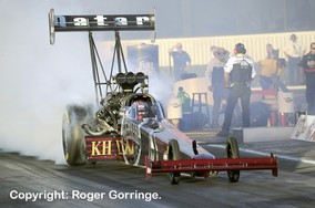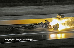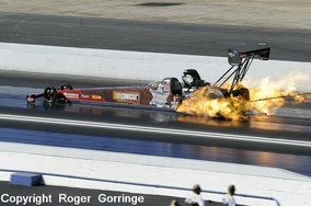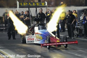 Round one casualties included Steve Torrence who hazed the slick against Antron Brown, Terry McMillen who went into tyre smoke at sixty feet against a pedalling Brandon Bernstein. A close race saw Shawn Langdon clinch the light as Ron August Jr. Followed, Bob Vandergriff lost to Morgan Lucas's holeshot but gave him a good race. Vegas runner-up Dominick Lagana got crossed up and into tyre smoke as Tony Schumacher charged to the win. The NHRA Full Throttle Champion was crowned in this round when Mike Strasburg lost to Larry Dixon's 3.854/318 giving the Al-Anabi team the prestigious trophy to defend in 2011. Doug Kalitta suffered a big fire in the lights but took the win casting out teammate Dave Grubnic and TJ Zizzo was beaten by Cory McClenathan. A repaired Doug Kalitta opened round two with a loss to Shawn Langdon, a 3.901/311 beat the troubled 9.354/76. Cory McClenathan who is surprisingly being let go by team DSR and Honeywell (FRAM) at the age of 47 as he no longer fits the age profile lost with a bang that deployed the chutes just off the line allowing Morgan Lucas to win with a 4.003/299, perhaps only the older generation purchase FRAM! New Champ, Larry Dixon held onto his holeshot and clicked the win light with a 3.881/306 as Brandon Bernstein chased, failing with a close 3.893/311. Tony Schumacher was beaten by half a car length by teammate Antron Brown with a 3.858/318 to a 3.878/303 to end the round. The semis provided more excitement when Shawn Langdon left first and held onto the lead whilst defeating the 2010 Champion Larry Dixon with a 3.860/312 to a 3.856/319 from the Al-Anabi race car. Morgan Lucas driving the Geico Powersports/Lucas Oil machine left a might too early putting on the red light in his lane and allowing Antron Brown a path to the final, 3.863/317 to a realised 5.435/139. The drama didn't end on the money run round as Shawn Langdon in the Lucas Oil/Speedco machine left a tad before Antron Brown but Brown hauled him in and despite a huge fire in the lights put on the winning 3.840/311 light as Langdon slowed to a 4.185/306 lose.