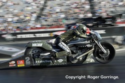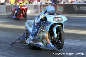 The opening round saw a few surprises as Craig Treble was beaten by Michael Phillips, Angie Smith saw off her husband Matt Smith and Eddie Krawiec trounced Freddie Camarena. Jim Underdahl beat Shawn Gann whilst Andrew Hines wasted his try with a red light against Steve Johnson. Matt Guidera was taken out by LE Tonglet and Karen Stoffer beat off the red lighting Bailey Whitaker and David Hope lost to Hector Arana to end the round. The quarter finals saw Jim Underdahl's holeshot take the win with a 6.950/193 beating the 6.923/191 from Karen Stoffer. Eddie Krawiec managed to easily overcome the holshot from Michael Phillips, a 6.881/195 beating the 6.971/189. The Pro Stock Motorcycle Full Throttle Championship was settled in this round when young LE Tonglet put down a 6.860/192 win to see off Steve Johnson's 7.018/178. Angie Smith's luck ran out when she ran a losing 20.335/30 as Hector Arana put down a 6.821/192 win in his lane. The new Champion on his Nitro Fish/GT Motorsports '98 Suzuki GSXR spoilt his day when a red light 6.861/193 disqualified LE Tonglet's run and giving the win to Eddie Krawiec's 6.921/192. Hector Arana ran a 6.856/192 to defeat the 6.936/192 from Jim Underdahl's Suzuki Extended Protection backed '02 Suzuki. The final pitted two past Champions, and it was Eddie Krawiec riding the Screamin Eagle Vance & Hines '10 HD V-Rod decked out in military combat green that took the light with a national record setting 6.811 at 196mph as Hector Arana redlit his way to runner up on his Lucas Oil Products '07 Buell.
