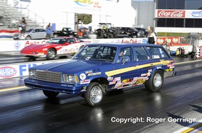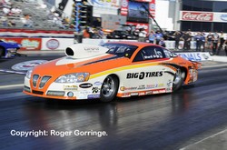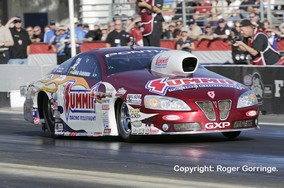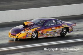 In round one wins went to Greg Stanfield over Ron Krisher, Ronnie Humphrey against a red lighting Vinnie Deceglie, Rodger Brogdon beating a crossed up launch from last year's Champ, Mike Edwards, V. Gaines beat Warren Johnson. The new Champ though was surprisingly beaten by inches by Jeg Coughlin Jr. and Allen Johnson took the win against a red light from Bob Yonke. Kurt Johnson got past a holeshotting Jason Line and Shane Gray overcame Dave Connolly. Round two opened with Shane Gray just beating Kurt Johnson in a 6.608/208 win to a 6.622/208 lose. Ronnie Humphrey failed to chase down the lead from V. Gaines, a 6.558/210 beating the 6.633/209. Allen Johnson won by about a half car length as his 6.592/210 got the light leaving Greg Stanfield a losing 6.589/209. The final pair had Jeg Coughlin Jr. score a 6.588/209 win putting Rodger Brogdon back in his trailer as his 6.578/209 was not quite enough. A retiring Jeg Coughlin Jr. ended his time in Pro Stock with a finals placing as opponent Allen Johnson in the Mopar/J&J Racing Avenger redlit away his chances, a winning 6.622/209 against a fouling 6.632/210. A real close race between Shane Gray and V. Gaines occurred to end the round, Gray's holeshot coupled with a 6.603/209 won by inches at the stripe as the quicker and faster 6.582/210 failed to get the Kendall Oil '10 Avenger past. The final saw Shane Gray's Big O Tires '10 GXP storm off the line with a 0.010 light against the 0.046 from Jeg Coughlin Jr.'s Jegs.Com Cobalt, it was all over in 6.566 seconds at 209mph as Gray notched up his first win leaving Coughlin Jr. a 6.568/210 runner up.
