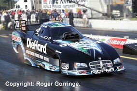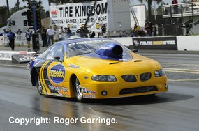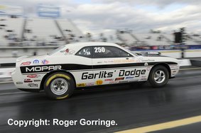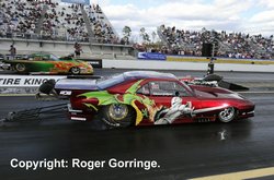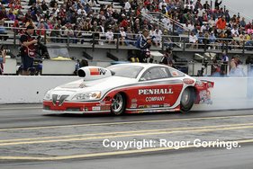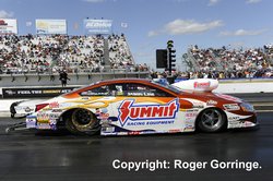 Eliminations were run throughout the early weekend to find the Phoenix winner who turned out to be Mike Edwards. Going out in round one were Vinnie Deceglie to Ronnie Humphrey, a red lighting Greg Stanfield to Jason Line, Steve Spiess to Greg Anderson, a tyre shaking Rodger Brogdon to V. Gaines, Shane Gray to Allen Johnson. Mike Edwards recorded another stunning speed 6.520 at 212.23mph beating Rickie Jones, Johnny Gray lost to Ron Krisher and finally Bob Yonke who runner-upped for the Phoenix event lost to Jeg Coughlin. Round two opened with identical leaves for Greg Anderson and Jeg Coughlin but Coughlin slowed with problems leaving Anderson the 6.587/210 win to the troubled 9.637/93 lose. Allen Johnson got the leave on V Gaines and stayed ahead to gain the light, a 6.600/210 to a 6.616/209 lose. A neat leave by Jason Line kept the lead over Ron Krisher a 6.582/210 win to a close 6.592/210 lose. Mike Edwards continued to dominate catching and passing the leave by Ronnie Humphrey, a 6.549/210 beating the 6.577/210 to end the round. In the semis Greg Anderson was off the power by the tree in his Summit Racing Equipment '09 GXP slowing to a 17.349/43 as team-mate Jason Line surged ahead to take a 6.606/210 win. Mike Edwards notched up another round win when his 6.564/211 got the win light over a losing Allen Johnson in the Mopar/J&J Racing '10 Avenger whose 6.596/210 was not enough. It was the first loss of the season for the Penhall/K&N/Interstate '09 GXP of Mike Edwards as Jason Line in the Summit Racing Equipment '09 GXP drilled him on the lights leaving him floundering, a 6.580/210 beat the 6.556/221 try.