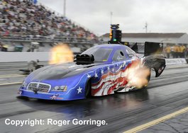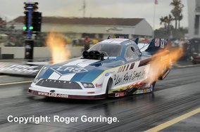 Popular fan favourite John Force passed an up in smoke Bob Bode to open round one, a winning 4.087/310 beat the troubled 8.061/98. Cruz Pedregon suffered the same tyre blistered tyre pass as Bode as he faced his brother Tony Pedregon, a 4.128/310 beat the 8.771/90. Ron Capps caught and passed the leave by Del Worsham running a winning 4.072/310 at over a car length to the losing 4.157/306. Matt Hagan upped the fastest ever speed in the class with a 4.061 at 316.15 mph in beating the 4.223/268 from John Smith. In a close leave Robert Hight managed to stay ahead and win by several car lengths, a 4.122/305 to the losing 4.223/301 from Jim Head. The next pairing was all female and what a pedalfest it turned into as Ashley Force Hood hit tyre smoke then pedalled out of a crossed up situation only for Melanie Troxel to get loose and pedal. Troxel took the win 5.324/158 to the 5.980/34 both getting rapturous applause from the appreciative crowd. Jack Beckman hit tyre smoke at two-hundred feet out that put paid to his event, a losing 6.672/94 had Bob Tasca III take the 4.139/308 win. The last pair in the frame were Tim Wilkerson and Jeff Arend and Arend suffered the tyre smoke as did Beckman slowing him to a 5.520/190 as Wilkerson took the 4.188/283 win. The second round opened with a close race as Tony Pedregon stayed ahead with his holeshot against Melanie Troxel, a 4.113/310 beat the 4.164/307 try. Ron Capps overcame the holeshot by John Force and the ticket read 4.066/312 for the win to the 4.135/310. A mere two-thousandths separated the leaves by Tim Wilkerson and Matt Hagan and Wilkerson clinched the deal with a 4.094/307 as Hagan slowed to a 4.465/284. The last pair saw the last of the Force team cars go out as Robert Hight struck the tyres at three-hundred feet out slowing him to a 4.804/178 as Bob Tasca III ran the winning numbers, 4.125/308. It was Tony Pedregon's turn to smoke the slicks in the semis as his Nitro Fish machine went almost immediately into smoke giving the race to Tim Wilkerson, a 4.149/298 to an 8.493/85 told the tale. Ron Capps driving the NAPA Filters Charger hazed the slicks and got a little wayward as Bob Tasca III took the light on a 4.125/308 to the 4.562/216 try. Not the usual favourites to go into the final but both well deserved as Tim Wilkerson in the Levi, Ray & Shoupe Inc Mustang left first, Bob Tasca III took off and drifted close to the wall in the Motorcraft/Quick Lane Mustang but it was Wilkerson all the way on a 4.097/303 win to the 4.192/287 lose.
