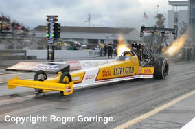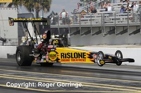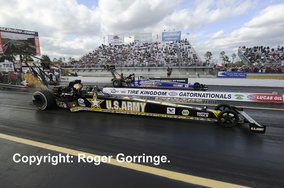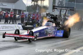 Round one delivered some major surprises as the left lane was not on-song with the first victim, Morgan Lucas going into tyre smoke leaving a tyre shaking Steve Torrence a 3.879/311 win to the 7.782/91 lose. Doug Kalitta fell foul to the same against Doug Foley, Kalitta's holeshot worth nothing as the tyre smoke belched out, slowing him to a 6.519/113 lose and seeing Foley get a 3.959/254 win. Shawn Langdon switched lanes with Chris Karamesines and it paid off as 'The Greek' smoked the hides allowing Langdon through with a small fire and a 3.919/299 win. The lane tables turned then as Dave Grubnic suffered tyre smoke in the right lane as Brandon Bernstein ran the winning 3.891/313 to the 7.263/87 lose. Antron Brown took a 3.973/229 win as Todd Paton slowed to a 7.079/94 lose. A real close race occurred next as Tony Schumacher kept ahead on his holeshot winning with a fine 3.818/320 as Terry McMillen chased hard with a 3.865/304 lose. Larry Dixon overcame the slight lead by Pat Dakin and clinched the win with a 3.824/319 to the 3.952/275. Last pair in the round was Cory McClenathan who raced by the lead from Bobby Laguna to record a 3.816 win at a fastest ever one-thousand foot 322.50mph as Laguna's 3.955/305 came second. Round two opened with Antron Brown powering ahead from half track the try from Steve Torrence, a 3.812/318 beating the 3.862/314. Brandon Bernstein hazed the slicks, got a little crossed up and pedalled but it was in vain as Larry Dixon's 3.831/317 lit up the score boards with the lose being 8.355/82. Doug Foley's day ended with a blower pop at three quarter track slowing him to a 4.332/179 as Tony Schumacher stayed ahead with a 3.839/319. Shawn Langdon showed his mettle as he left on Cory McClenathan and stayed ahead in a close match, a 3.852/317 got the nod to the 3.840/315. The fastest ever one-thousand foot speed fell again in the semis as a match up between Tony Schumacher and Larry Dixon in the Al-Anabi car kicked off, 'The Sarge' left first and held on to record a great 3.822 at a whopping 324.98 mph win as Dixon followed with a losing 3.825/319. Antron Brown kept up his good weekend with a 3.801/318 win over the Lucas Oil/Speedco dragster of Shawn Langdon whose 3.909/304 was not quite enough. The final pitted reigning Champion Tony Schumacher in the US Army machine against team-mate Antron Brown in the Matco Tools car. Schumacher left first and despite a flash fire in the lights took the event win with a great 3.797/322 as Brown pedalled to a losing 6.632/101.