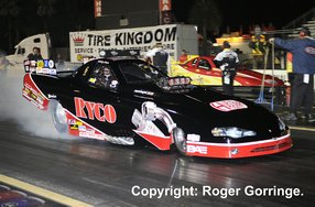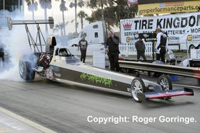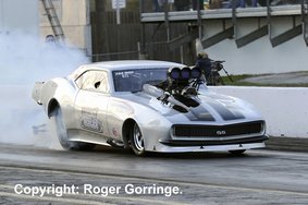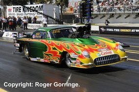 Round one victims in this tough class were Tim Tindle to Sweden's Micke Gullqvist in a Roger Burgess Camaro, Tony Pontieri beaten by Qatar resident Khalid Balooshi, Troy Coughlin who red lit and shook against Kenny Lang, Rickie Smith lost to Burton Auxier, Mike Knowles to Joe Baker, Chip King was beaten by Melanie Troxel, Ed Hoover lost to Jay Payne and Sweden's Adam Flamholc was beaten by Roger Burgess. In round two the stakes were raised as Burton Auxier ran a winning 5.943/237 beating Jo Baker's '68 Firebird's losing slowed up 6.853/160. Ken Lang then took the win as Melanie Troxel got off the power at three hundred feet, 5.883/244 to the troubled 8.028/125. The next pair was visitor against boss as Micke Gullqvist ran a winning 5.827/248 as Roger Burgess got loose at half track kissed the guard wall and shot across lanes to be disqualified. Another visitor, Khalid Balooshi then got shot of Jay Payne, a 5.877/245 beating the 5.913/244 to end the round. In the semis Canadian Ken Lang holeshot the Al-Anabi '68 Camaro of Khalid Balooshi and held on for the win light, a 5.932/244 beat the 5.909/245 by a fender. Burton Auxier shut of by the tree on his duel with Micke Gullqvist, the 5.857/248 getting the win against the losing 11.983/81. It was a first for the history books in this first ever NHRA backed Pro Mod event and it was contested by two foreign drivers, Ken Lang from Canada driving the '53 Corvette against the '68 Camaro driven by Swedish driver Micke Gullqvist. It was all over on the startline as Gullqvist red lit then blew the tyres off slowing to a 10.977/109 as Lang became the winner with a 5.908/243 time slip. The Top Alcohol Dragster final became a battle between Duane Shields and Darren Nicholson, and it was Shields in the Shortline Express Markets that triumphed with a 5.362/267 as Nicholson slowed with problems to an 8.334/114. Eurodragster.com sponsor Michael Manners had traction problems and qualified fifteenth, making a first round exit. Top Alcohol Funny Car saw Frank Manzo in an Al-Anabi backed '10 Monte Carlo take the trophy with a 5.475/265 as opponent Mickey Ferro in the Ryco Hydraulics chased hard with a losing 5.498/262. Eurodragster.com sponsor Ulf Leanders qualified tenth with a 5.781 but went out in the first round of eliminations. Competition Eliminator had Arnie Martel in a '07 GTO take the win with a 7.891/170 as Glen Treadwell chased with a losing 7.857/159.