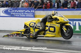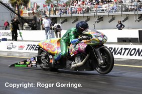 In round one Junior Pippin the earlier top qualifier went out to Shawn Gann, Matt Smith was beaten by Steve Johnson, Michael Phillips red lit against Craig Treble, LE Tonglet lost to Champion Hector Arana, Mike Berry red bulbed against David Hope, Angie Smith went down to Eddie Krawiec, Karen Stoffer beat Redell Harris and in the final pairing of the round Jim Underdahl went the red light way against Andrew Hines. Red lights were most prevalent in round two as were six second passes, very similar to round one. David Hope lost with a red light 6.939/189 as Craig Treble seeing the light slowed to a 7.038/186. Andrew Hines got a little too urgent as his red light put him on the trailer leaving Hector Arana a 6.916/191 win to the 6.891/190. It was Steve Johnson's turn to get the evil eye; a 7.149/159 gave the win to Eddie Krawiec's 6.856/194. No red light in the last pair but it did see top qualifier Karen Stoffer fall by the wayside, a 6.979/187 lost to the 6.945/192 from Shawn Gann. In a surprise lose Hector Arana's Lucas Oil Products '09 Buell carded the rounds only red light, a wasted 8.316/110 as Shawn Gann won on a 6.907/193. Craig Treble's Valvoline backed Suzuki TL1000 was run down and passed as the 6.971/189 was bettered by the 6.903/194 from Eddie Krawiec. In the final it was the '10 V-Rod of Eddie Krawiec backed by Screamin' Eagle/Vance & Hines that got to the stripe first, a winning 6.899/195.68 beat the charging Rum Bum Racing '09 Buell XB9R of Shawn Gann whose 6.908/194 was left in the wake.