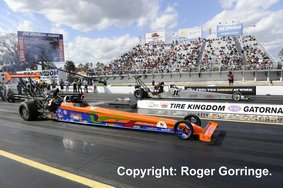 2010 Tire Kingdom NHRA Gatornationals After what many described as the coldest winter in Florida, the third event in the NHRA Full Throttle Drag Racing Series was held up for almost two days out of the four by cold, torrential rain storms and frequent localised tornado warnings. The track crews and event staff were plagued by wet track conditions and soggy pits, with some areas a quagmire if teams were not on hard standing. One Pro qualifying session was managed on the Friday after no Sportsman action on the Thursday, and it was then a well organised rush to complete the meeting by late Sunday evening. The cool and somewhat breezy conditions gave rise to some great times and speeds with some of the Fuel cars recording times over the one-thousand feet mark more typical of the old quarter-mile times. It was another international gathering as racers from Canada, Qatar and Sweden came up against and sometimes beat the Americans at their own game all in front of a near capacity crowd of dedicated race fans. Click on any picture for large version, and scroll down for additional photographs