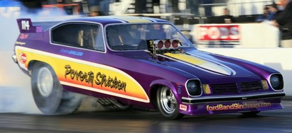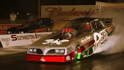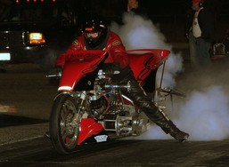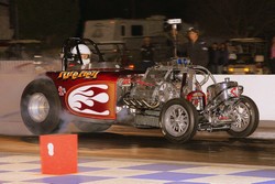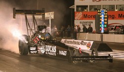 Fuel Altered provided some superb action. Four cars took to the track for Round 1, but a hard contact with the side wall following a sharp right-turn off the startline saw an early exit for Ron Maroney and his beautifully prepared and presented Super Nanook. Chris Bennett's Pure Heaven Bantam took the honours with a fine pair of passes, 6.626/166.93 and a final-winning 6.406/194.02. "Insane" is how IHRA Media Director Larry Crum described the riders of the Nitro Harleys in his pre-race release, and who could argue? Mike Scott took away the Ironman trophy for the win with a magnificent 6.867/203.89 blast into the darkness over previous points leader Steve Dorn. Following the weather-delayed March Meet the previous weekend, the trip to Tucson was just a short hop for Pennsylvania-based Peter Gallen, and the Poverty Stricken Vega continued a run of fine performances to carry off the Prostalgia Funny Car win over fellow East-Coaster Mike McIntyre in the magnificent McAttack Z28 Camaro. Gallen's 5.777/250.97 effort, to McIntyre's very close 5.808/232.39, won the team a new ET record for the class and with it another Ironman trophy. Once again it was Lagana's day, the newly-sponsored Lucas Oil car taking the Top Fuel win for the second time on the weekend with a fine 4.772/311.03. Another double for Chris Bennett in Fuel Altered, this time with an uncharacteristically arrow-straight charge for the line, completed in just 6.442 seconds at 214.28 mph. Runner-up Jason Richey, also sporting a Bantam body, completed the lap with a slower but equally direct 6.921/217.63. The boot was firmly on the other foot this time aroundin Nitro Harley, with Steve Dorn stamping his authority over the previous night's winner Mike Scott. Off the line both bikes enjoyed good clean runs, and it was a close-run thing too, Dorn taking the startline advantage with a 7.102/207.59 to Scott's 7.161/210.87. Other classes