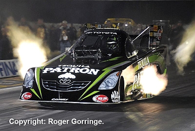 Round one saw a few surprises as firstly defending Champion John Force went out to Johnny Gray, Force left first then floundered slightly running a losing 4.271/290 as Gray charged by with a 4.090/313 win. Cruz Pedregon who sat in third spot in the point chase caught and passed Bob Tasca III, a 4.141/313 beating a 4.199/308. Melanie Troxel took the win light with a 4.151/303 from behind as Tony Pedregon lost power at four hundred feet slowing to a 5.022/162. Robert Hight met Gary Densham and beat him out of the hole staying ahead to win on a 4.149/309 to a 4.269/266. Point leader Matt Hagan managed to catch and get by a quicker leaving Jon Capps, a 4.092/309 won to the 4.602/236 lost. Alexis DeJoria got a tad too quick and red lit away her chances allowing Mike Neff a 4.150/311 win. Ron Capps and Jeff Arend carded identical R/Ts but the 4.110/311 from Capps got the nod over the 4.140/299 lose. Jack Beckman who came into the event one point behind Hagan took a grateful win of 4.522/280 as opponent Tim Wilkerson went up in smoke one hundred and fifty feet out. Johnny Gray managed to get rid of another Force machine as the holeshot 4.105/313 took out the 4.155/308 from Mike Neff kicking off the second round. Robert Hight kept one of the Force cars in contention by beating Las Vegas winner, Ron Capps 4.091/311 to a 4.114/311. Jack Beckmans championship point hopes were dashed when he met leader Matt Hagan, a 4.107/307 from behind beat Beckmans 4.142/310. Cruz Pedregon kept his title hopes alive when he advanced past Melanie Troxel, 4.079/312 to a 4.154/308 and in a bizarre incident Troxels In-N-Out Buger car re-fired in the turn off area sending her through an inflatable advertising, a fence and into a trailer, she was shaken but ok. The semis saw revenge for Team Force as Robert Hight caught and passed Johnny Gray in the Service Central Dodge Charger a 4.079/315 beat the up in smoke off the line 7.473/83. Matt Hagan made sure he stayed well ahead of point chaser Cruz Pedregon in the Snap-On/Wix Filters Toyota with a decent R/T coupled with a 4.096/309 beating the 4.113/311 this secured Matt Hagan the 2011 NHRA Full Throttle Funny Car Championship. As in the Top Fuel category the event win went deservedly to the new Champion but not without a fight, Matt Hagan in the Advanced Gold DieHard Charger left another good light on the tree and stayed ahead all the way recording a stunning 4.009/317 to take the win as Robert Hight in the Automobile Club of Southern California Mustang became event runner up with a 4.031/318.
