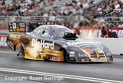 Round one witnessed Dave Grubnic beat teammate Doug Kalitta in a 3.846/313 win to a 3.863/308 close lose to open the day. Antron Brown managed to keep a nose ahead of Bob Vandergriff in another tight race. Morgan Lucas suffered a small flash fuel fire in the lights but lit his win light as Troy Buff limped in with the lose. Tony The Sarge Schumacher took the win as Clay Millican went up in smoke off the line. Larry Dixon had a neat break when his machine shut down and popped the chutes at one hundred feet out but still winning as rookie racer Keith Murt red lit away his chances. Del Worsham made short work of Mike Ashley, a holeshot 3.865 took out the 3.904 try. Spencer Massey kept his title hopes alive with a 3.824/324 win against Cory McClenathans 3.908/282 and finally Brandon Bernstein lost pistons and had TJ Zizzo nip past him only to then take back the lead for the all important win. The next round started with Del Worsham taking the lead off the line and never looking back, as 3.850/316 took the light as Dave Grubnics close 3.880/304 lost. Antron Brown saw his chances go away as Larry Dixon won by inches in a 3.828/320 to a 3.837/316 bout. Spencer Massey beat points outsider Morgan Lucas whose 4.206/225 suffered a small flash fire at eight hundred feet but it was Masseys winning 3.846/316 that oiled the track. The last pair had Branden Bernstein make possibly his last pass as he parks his ride due to lack of sponsors for next year, it was a disappointing up in smoke 6.644/98 as Tony Schumacher charged off to a 3.826/322 win. It was a round of big team battles as the Don Schumacher Racing guys took on the Alan Johnson Al-Anabi boys, it ended with one apiece. Tony Schumacher notched up a 3.823/322 holeshot win as Larry Dixon chased but failed to catch with his 3.828/313 timing. The other pairing saw the Full Throttle NHRA Top Fuel Championship going to Del Worsham as the 3.800/322 caught the small lead produced by Spencer Massey in the FRAM machine, a 3.808/322 came second by just inches. The final dealt the two big teams their hands and the new Champion Del Worsham was not content with the title, his quicker R/T coupled with a 3.796/318 got him the event win in the Al-Anabi car as the U.S. ARMY machine of Tony Schumacher became runner up with a close 3.799/321.
