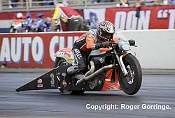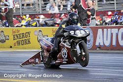 Round one opened with Angie Smith getting around Michael Ray a 6.961/191 beating the 6.997/191 winning by about a bikes length whilst husband Matt Smith chased down and won the race with Chip Ellis, 6.944/191 to the losing 6.967/191. Outgoing Champion LE Tonglet managed the win with a 6.942/191 over Gerald Savoies better leaving 7.076/175. Andrew Hines took out number sixteen qualifier Michael Phillips with a 6.865/196 to a 6.999/192. Young Hector Arana Jr. ran a 6.836/195 to beat the losing 7.044/192 from Justin Finley. Point leader Eddie Krawiec put a 6.873/169 on the win board beating Karen Stoffers 6.993/191. Hector Arana Sr. ran a 6.905/193 to see off Jim Underdahls 7.060/189 and the final pairing had Steve Johnson take the win despite not finishing as Shawn Gann red lit. The action continued into round two starting with the defeat of Steve Johnson, his seven dead at 192mph was ably taken care of by the holeshot and a 6.876/193 from Hector Arana Sr. Angie Smiths day ended when her 6.955/191 was beaten by the better leave and 6.854/196 from Andrew Hines. With the ousting of LE Tonglet on a holeshot 6.937/191 to a winning 6.853/196 Eddie Krawiec became the 2011 NHRA Full Throttle Pro Stock Motorcycle Champion. The last pair in the round was a battle between Matt Smith and young Hector Arana with the latter getting the better leave coupled with a 6.847/196 win to the losing 7.357/142. Both Aranas were taken out in the semi finals by teammates Hines and Krawiec. Hector Arana Sr. on his Lucas Oil Products 10 Buell failed to keep up with the leave by Andrew Hines, a 6.880/195 beating the close 6.894/193 after a staging duel. Hector Arana Jr. carded a great light on his Lucas Oil Products 11 Buell but that and the 6.863/190 were no match for the charging 6.831/195 from Eddie Krawiec. The finals was a team effort, the newly crowned Champion Eddie Krawiec and Andrew Hines both on their Screamin Eagle Vance & Hines 11 HD V-Rods faced off for the money run but Krawiec blew his chances of an event win to put icing on the cake when he red lit away a 6.819/197 to a winning 6.814/196 from Hines.