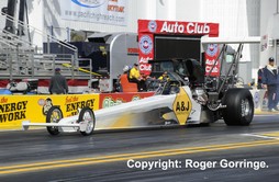 If you ever thought we had some tough weather at some events in Europe then think again as in the normally sunny California, the climate was cold and damp. Thursday was cool and dry, Friday was rained out after just a few Sportsmen ran and Saturday's forecast predicted rain and possible snow! The event, the first in the NHRA Full Throttle series this season went relatively well, surviving the cold and just a small amount of the wet stuff, the Pro categories managed to run their finals along with Top Alcohol Dragster and Top Alcohol Funny Car, the remainder had to run their rounds on the Monday. It is the NHRA's sixtieth anniversary and the fifty-first Winternationals, part of the celebrations was the tribute to Don 'The Snake' Prudhomme and many of his old Top Fuel and Funny Cars were on display in the pits under the backdrop of the snow-capped San Gabriel Mountains.