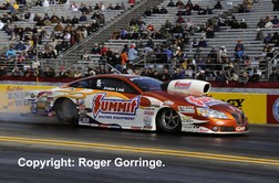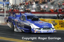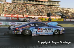 Eliminations started badly with a double oil down as an on fire Bob Bode lost to Jim Head. John Force managed a 4.115/310 over Paul Lee's 4.456/202 and Gray's luck ran out as Jeff Arend took a wild win in his lane. Neff managed to get by a cylinder losing Tim Wilkerson whilst an all brothers bout saw Cruz get the better of a tyre spinning and pedalling Tony. Robert Hight pushed his machine to a 4.121/305 win against Bob Tasca III and a 4.060/308 got Matt Hagan past a slowing Gary Densham. In the last pairing of round one Ron Capps managed a 4.134/306 to defeat Jack Beckman. Round two continued with Neff beating Head, 4.243/293 against the 4.231/284. A team battle saw Hight get the 4.107/308 win as boss Force took a wild top end charge lose of 4.123/309. Cruz Pedregon's weekend ended with a smoking 5.225/157 as Ron Capps ran a winning 4.117/306 to advance. Matt Hagan managed to catch and pass the better leave by Jeff Arend, a winning 4.106/305 seeing off the 4.161/295. The semis saw a great race as Robert Hight led out of the hole with Ron Capps in the NAPA Auto Parts '09 Charger in hot pursuit, a winning 4.070/312 from Hight beat the 4.079/307 from Capps. In the other pairing, Matt Hagan dispatched the Castrol GTX Mustang of Mike Neff with a 4.138/302 to the losing 4.122/306. Again for the final Robert Hight in the Automobile Club of Southern California Mustang got the better light and stayed ahead of Matt Hagan's DieHard '09 Charger, the 4.056/312 beat the better 4.023/310.