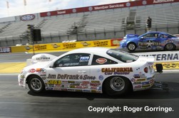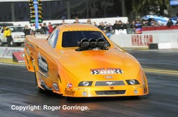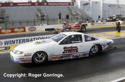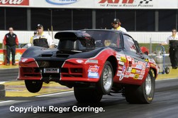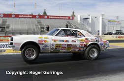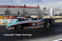 Sean O'Bannon was number one Top Alcohol Funny Car qualifier with a 5.522/258 leading the fourteen car field but he went out in round one. The final pair were Tony Bartone in the Centre Pointe Collision Ford Mustang and the '07 Monte Carlo of Doug Gordon backed by Morro Bay Cabinets and an identical leave saw them battle all the way to half when Bartone pulled ahead winning with a 5.452/264 to the losing 5.579/259.